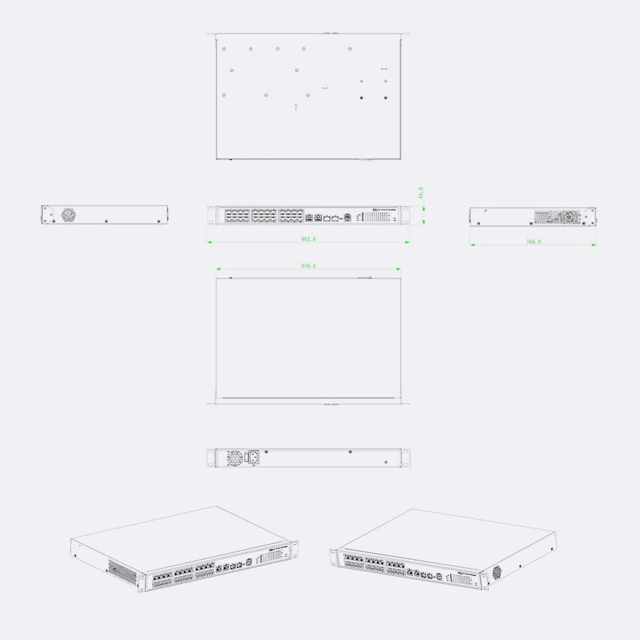 - jeweils 2 Uplink-Ports (Ethernet, SFP), 2 davon nutzbar