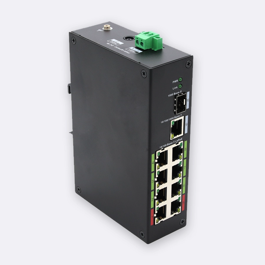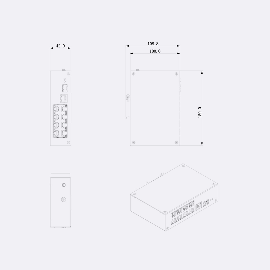 8-fach PoE Switch im Industriedesign mit extra großem Temperatureinsatzbereich von -30 °C ~ +65 °C. Die Gesamt-PoE-Leistung beträgt 120 W (Port 1 & 5: max. 90 W/Port, Rest: max. 30 W/Port).